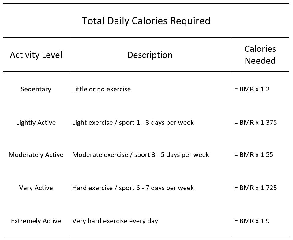 Once BMR has been calculated, use the table below to determine activity level, and adjust the daily calories needed accordingly.