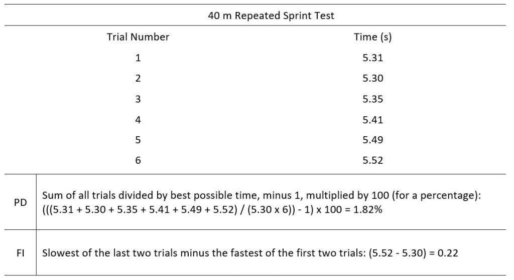 The description of the two measures, an example test, and a calculation is shown in the table below. The lower the PD and FI, the greater a player’s anaerobic capacity, as they can maintain anaerobic output over a prolonged period.