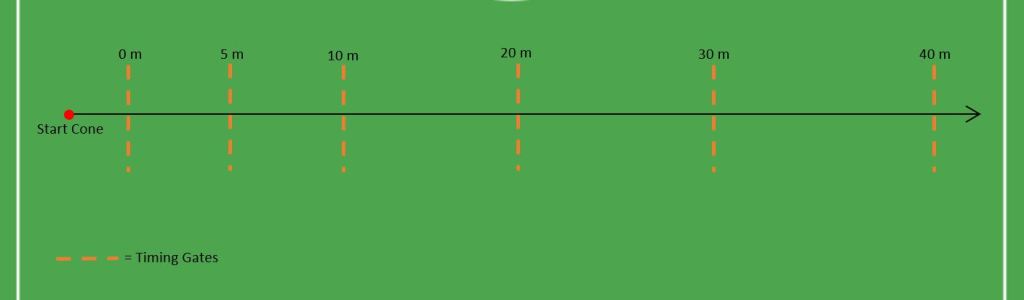 Therefore, it is recommended that players should be tested over 5 – 40 m, with intervals as shown in the diagram below. If available, timing gates should be used as they give the most accurate measurements in this test, and each player should be given 3 attempts at the test, with self-selected maximal rest in between attempts [77].