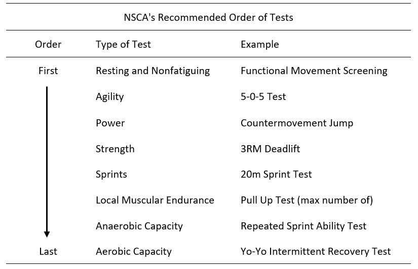 This section has outlined on-field and gym-based tests that can be combined into a comprehensive testing battery for use with soccer teams. The data collected from these tests will provide coaches and staff with physical profiles for each player, in a setting that is low-cost, requires minimal equipment, and is very soccer-specific. These profiles can then be used to prescribe training throughout the season. Testing should be conducted multiple times throughout a season to give staff initial benchmarks for players, and then data to see whether players’ physical capabilities are increasing or decreasing, and if their training is working. Testing should be carefully structured to allow the best data to be collected from players, and the table below outlines the National Strength and Conditioning Association’s recommendations for how to structure a testing battery.