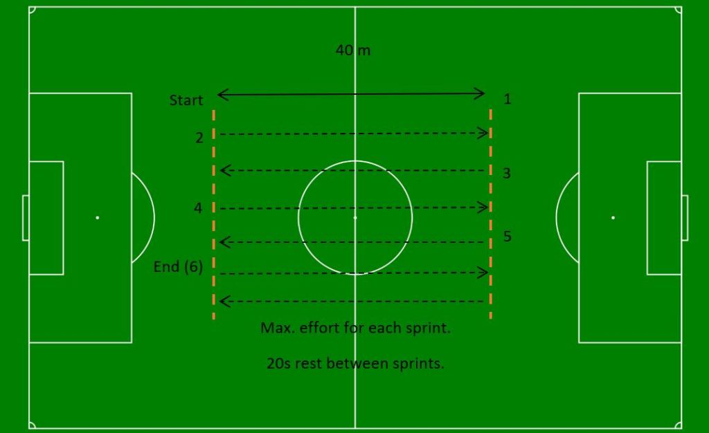 The repeated sprint ability test is very adaptable, and much like the other tests can be varied to give coaches and staff more useful and worthwhile data for them. The figure below shows an example of how this test should be set up and carried out.