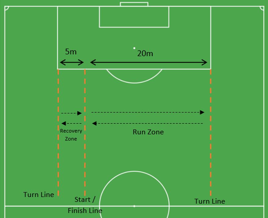 The Yo-Yo Intermittent Recovery Test 2 (YYIR2) is an intermittent 20 m shuttle run test, where players must continuously complete two 20 m runs (as shown in the diagram) in a set time, with a 10s recovery between. The time to complete the two runs decreases as the test goes on.