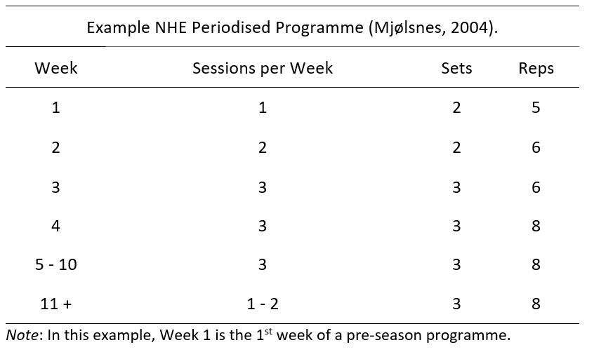 It has long been known that the eccentric contraction of the hamstrings during sprinting and high-speed running activities results in very high forces being applied through the hamstring muscles. These high forces have been shown to be strongly related to hamstring injuries [64]. As soccer training and match play involves many high-speed and sprinting actions, it is reasonable to conclude that players, especially those in the more sprint-demanding positions, will be at risk of hamstring injury. These injuries can take anywhere from 10 days to over 2 months to recover from, depending on the severity of the injury, and we should therefore pay close attention to minimising the risk of these injuries occurring. One exercise to achieve this, that has a large amount of clinical and soccer-specific evidence behind it, is the Nordic Hamstring Exercise (NHE). The NHE has been shown to significantly reduce both the risk of hamstring injuries, and hamstring injury severity in soccer players [1][28], while studies analysing its effects across multiple sports have shown the NHE to essentially halve the risk of hamstring injury [74]. The NHE has also been shown to have no negative effects on sprinting and jumping performance, while having a possible positive impact on 5 – 10 m sprint and CMJ height in elite soccer players when added to training programmes [35]. The way to perform this exercise is shown in the Figure below, and an example NHE programme is shown in the Table below. Due to the large amount of evidence supporting this exercise’s role in injury prevention in soccer, the minimal equipment required, and relatively few repetitions needed to have a significant effect, it is recommended that coaches consider adding the NHE to players’ gym routines.