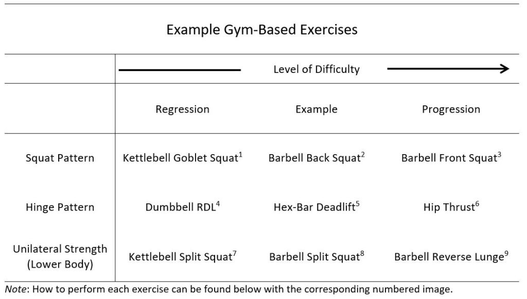 Possibly the most common exercises soccer players perform are squat and hinge pattern exercises, for example, the barbell back squat and the hex-bar deadlift. These are commonly used due to their ease of implementation, and their transferability to soccer performance as research shows that developing high levels of lower-body strength improves sprint and jump ability in soccer players [12], which are important factors in soccer performance. For example, back squat programmes have been shown to improve athletic performance in soccer players, with only 2 sessions per week [11]. Likewise, improvements in maximal squat strength have been shown to improve maximal and relative strength, countermovement jump (CMJ) performance, and short-distance (> 20 m) and longer distance (30 – 50 m) sprint performance, during the competitive season [14][66]. Deadlifts using a hex-bar are also commonly used for improving lower-body strength as the hex-bar makes it easier for players to learn the correct technique and load the exercise compared to a traditional bar or a back squat. The Romanian deadlift can be used to eccentrically load the hamstrings, which is recommended as a hamstring injury prevention exercise [73]. Examples of how these exercises can be progressed and regressed can be found in the Table below.