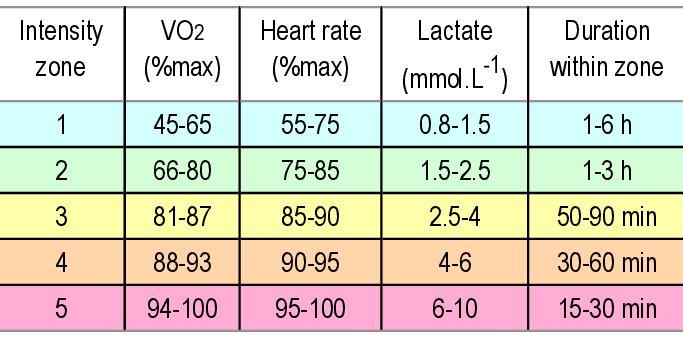 This data can be used to prescribe exercise at various intensities, with LT being moderate intensity, and above LTP being considered heavy exercise. You can use these two tests to plan training in accordance with the ‘Five-Zone Scale’ shown below.
