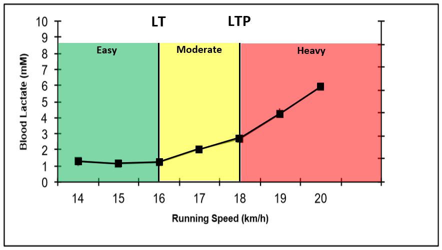 We can interpret the graph using what is known as the Lactate Threshold (LT) and the Lactate Turnpoint (LTP). LT is the exercise intensity where there is a steady increase in resting blood lactate levels. LTP is the intensity at which blood lactate levels sharply rise, to an unsustainable level.