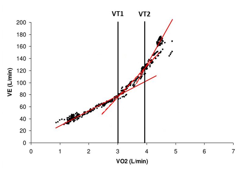 The final lab-based test we will discuss is the Ventilatory Threshold test. This can be conducted alongside the lactate profile test using the gas analyser. It follows the same protocol and gives us another indicator of where the true LT and LTP occur. This is because the first ventilatory threshold VT1 occurs at the same point as LT, and the second ventilatory threshold VT2 occurs at the same point as LTP. VT1 is characterised as the point where minute ventilation (VE) increases at a rate faster than the rate of O2 consumption. VT2 is characterised as a further increase in VE from the linear pattern after VT1. As this is difficult to visualise, the graph below shows what a typical ventilatory threshold test’s results may look like. From this graph we can see what speed or time corresponds to the VO2 consumption at each identified threshold to see whether the data agrees.