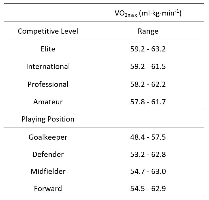The opposite table shows how VO2max can vary between competitive level and playing position. This shows that the aerobic demands of each playing position also vary, which is important when planning training to meet and exceed match demands.